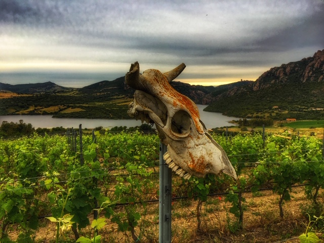 Alcuni paletti che delimitano le vigne sorreggono dei teschi di bovino. Nella tradizione sarda gli animali con le corna proteggano dal male. Il male qui è rappresentato dalle malattie della vite, dai branchi di animali selvatici che si nutrono dei frutti e dai venti impietosi. Un paio di giorni prima della nostra visita, le vigne erano state sferzate dalla rabbia del vento di Maestrale, carico di sale marino, che ha bruciato le viti. Le foglie si sono arricciate assumendo un colore bruno; il cannonau si è salvato ma per buon parte del vermentino non è andata così, la produzione per la vendemmia 2019 sarà sicuramente molto ridotta. Carlo lo dice con rassegnazione; è la natura.