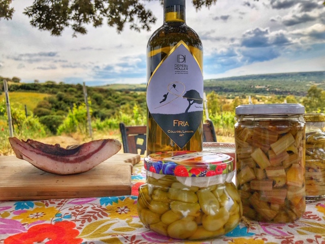 Ci portiamo sotto una grossa quercia, con la sua chioma sovrasta un lungo tavolaccio di legno tenuto in piedi da cavalletti, qualche seduta di fortuna intorno. Sembra un banchetto abbandonato da anni, così non è. Carlo estrae dalle sacche tutto, e dico tutto, quello che occorre per trasformare un luogo abbandonato in un sontuoso pic-nic. Da quelle borse escono una pittoresca tovaglia, stoviglie di coccio e metallo, calici da vino e poi cibo. Anzi è riduttivo: Tatiana e Carlo riescono ad estrarre da quelle sporte un pezzo di tradizione e cultura sarda; così compaiono sulla tovaglia di cotone colorato preziose leccornie che raccontano un popolo. La Conzedda, con la forma di una provola, è un formaggio fatto con latte bovino di alpeggio che non viene scremato; il formaggio è grasso pastoso ma non stucchevole, si fa sciogliere appeso sopra le braci e fatto colare direttamente sul pane. Il muffato di pecora, il vignaiolo agita orgoglioso il piccolo contenitore e dice “questo dovete proprio assaggiarlo”; un pecorino erborinato, al naso la complessità dei sentori di stalla e di sottobosco, l’assaggio è potente di grande sapidità e pizzicore. Non può mancare il pane dei pastori, il Pistoccu, più spesso e croccante del più famoso Carasau. Poi arrivano tanti vasetti di vetro, sono le conserve di famiglia, fatte con l’olio delle loro terre: fave, cardi ed asparagi selvatici.