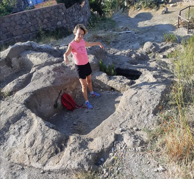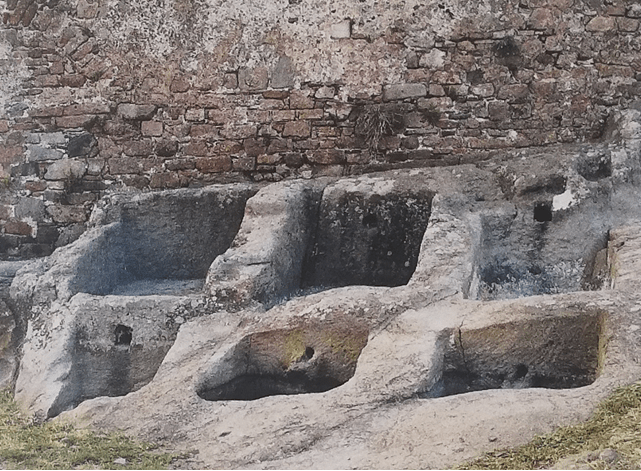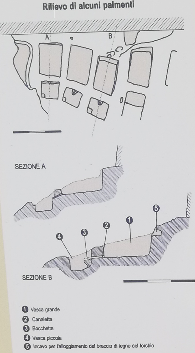 Come funziona un palmento? Semplice: ci sono due vasche comunicanti, collegate da un piccolo foro, dove in quella superiore veniva messa l’uva, si pigiava e il mosto defluiva nella vasca inferiore, che veniva raccolto e trasportato in cantina. I residui venivano poi torchiati per ottenere ancora un poco di mosto.