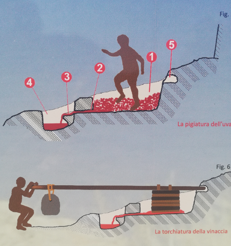 Sull’isola di Capraia, sono presenti molte vasche scavate nella roccia, utilizzate per la pigiatura, a piedi nudi, dell’uva e, in una seconda fase, per la torchiatura: sono i palmenti; troviamo traccia di questo rudimentale sistema di vinificazione anche nelle altre isole toscane, ma soprattutto in Calabria, dove la città di Ferruzzano è addirittura chiamata “la città dei palmenti”, in Basilicata, in Sardegna e pure nel Castello Aragonese di Ischia (e questi li abbiamo visti, ma sono sicuramente più recenti di quelli capraiesi in quanto strutture già al chiuso e non scavate nella roccia).