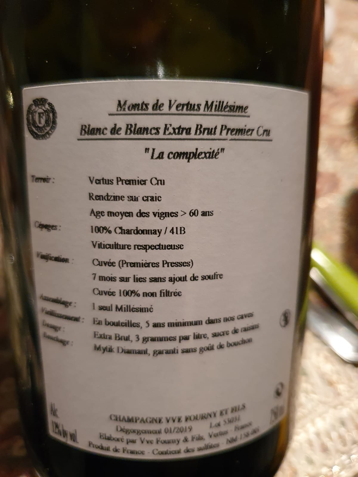 Abbiamo provato il suo millesimato 2013 (buona annata da quelle parti) naturalmente Blanc de Blancs con dosaggio bassissimo (3 grammi/litro) da vecchie vigne di oltre 60 anni di età, sboccatura gennaio 2019, senza solfiti aggiunti.