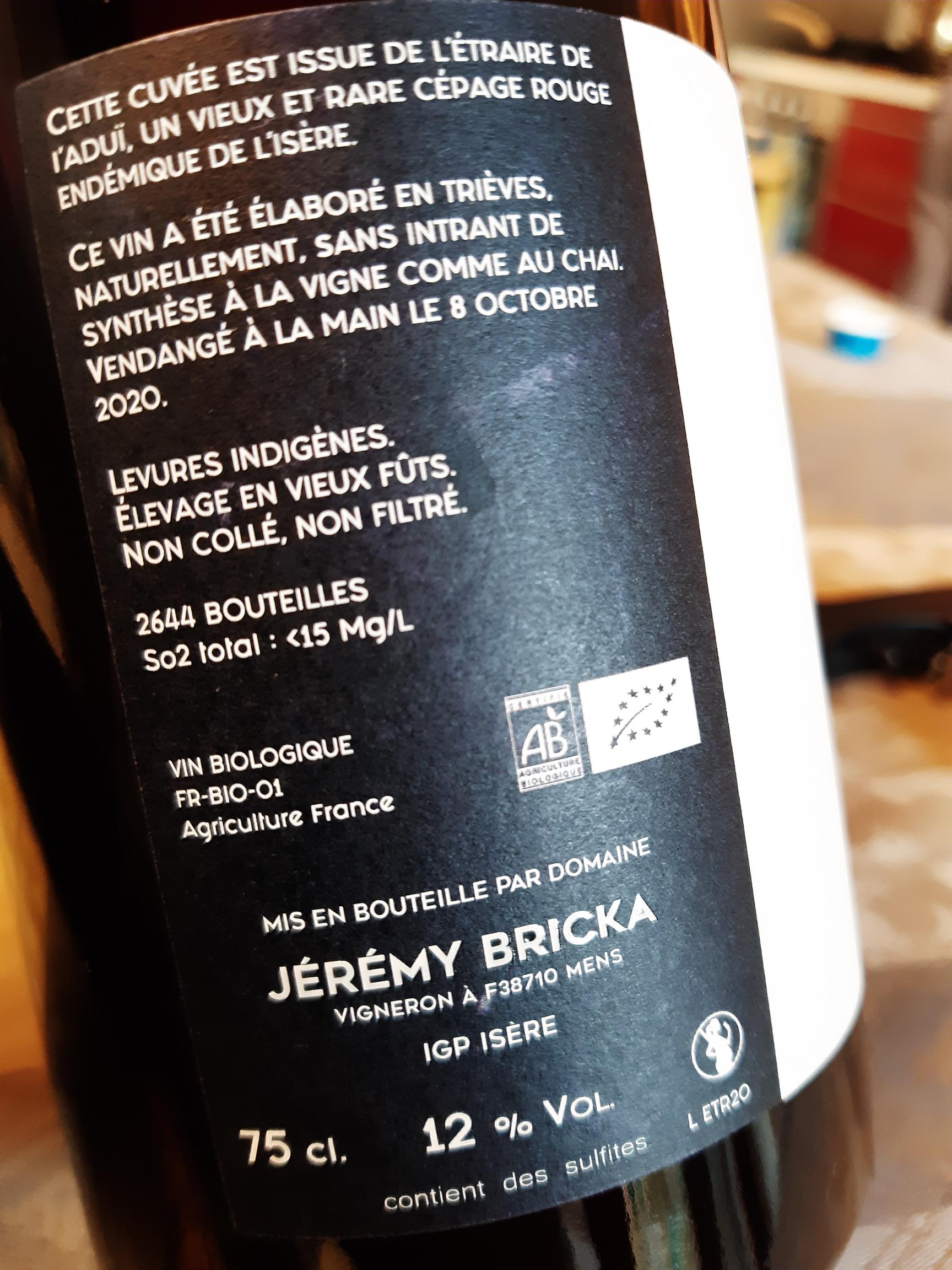 Dopo anni di gavetta in Borgogna e Rodano (chez Guigal!) Jérémy, affascinato dai territori alpini, compra 5 ettari in Isère tra i 500 e i 700 metri di altitudine, a Mens (non lontano da Grenoble), e vi pianta verdesse, mondeuse blanche e noir, altesse, persan, douce noire e la pressoché sconosciuta étraire de l’Aduï. Certificazione bio e approccio enologico non interventista, oltre ad una sensibilità fuori dal comune in fase di vinificazione, hanno permesso al domaine di acquisire una buona notorietà in Francia nella nicchia dei vini naturali. Il vino di cui ti parlo oggi è proprio quello ottenuto dal vitigno étraire de l’Aduï.
