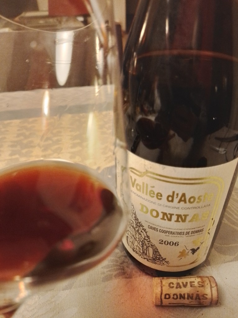 Siamo in Valle d’Aosta ed in particolare a Donnas, la prima DOC della regione (1971). Da oltre 50 anni la cooperativa Caves de Donnas riunisce numerosi piccoli viticoltori commercializzando circa 100.000 bottiglie ogni anno. Il Donnas del 2006 risultò fin da subito molto riuscito e ne comprai diverse bottiglie, approfittando anche del prezzo particolarmente accattivante (se ricordo bene circa 8 €). Una bottiglia l’ho sepolta in cantina e l’ho stappata con grande curiosità a 18 anni dalla vendemmia. Si tratta di un vino ottenuto da nebbiolo in prevalenza (90%) con freisa e neyret a saldo.