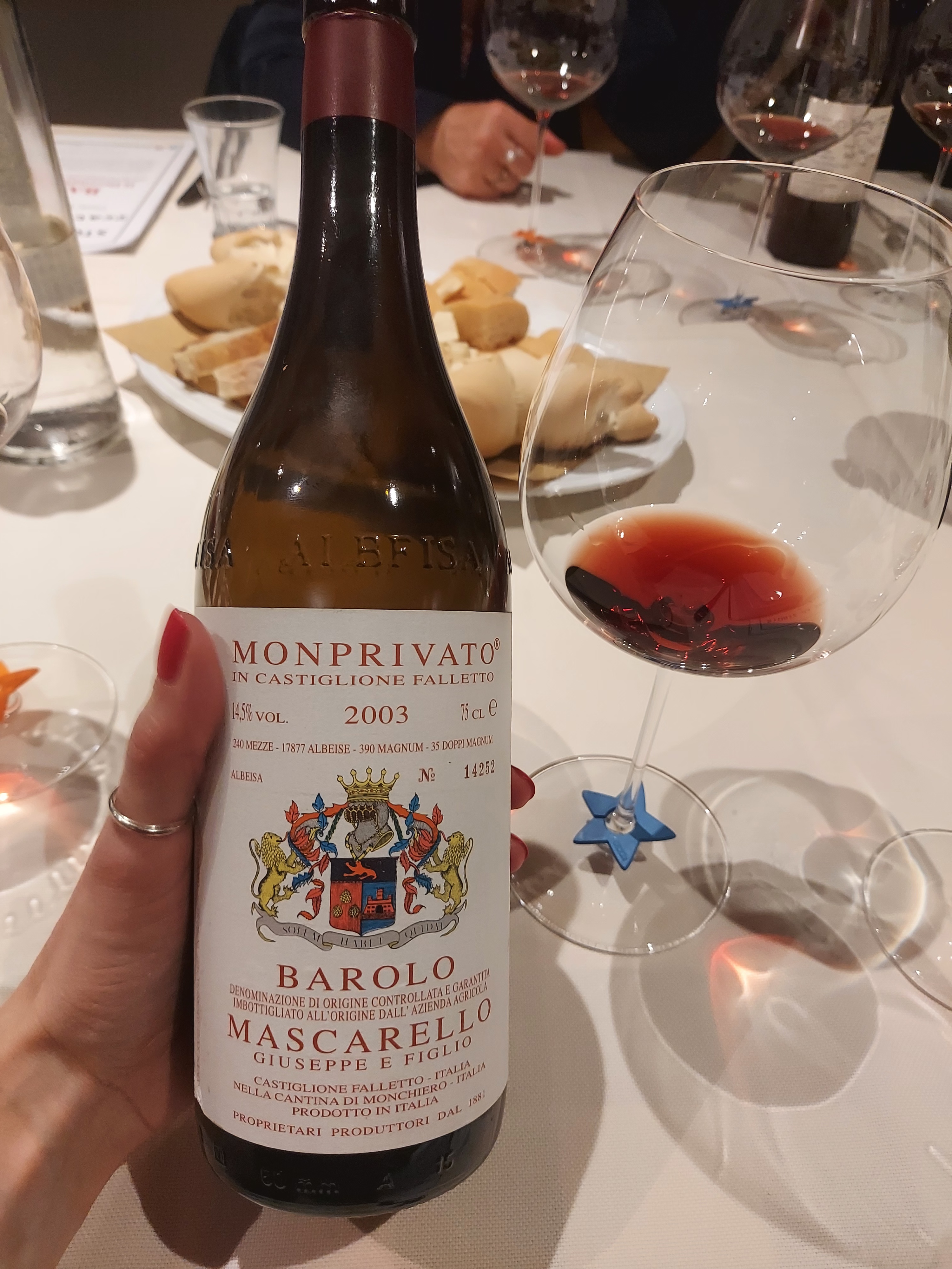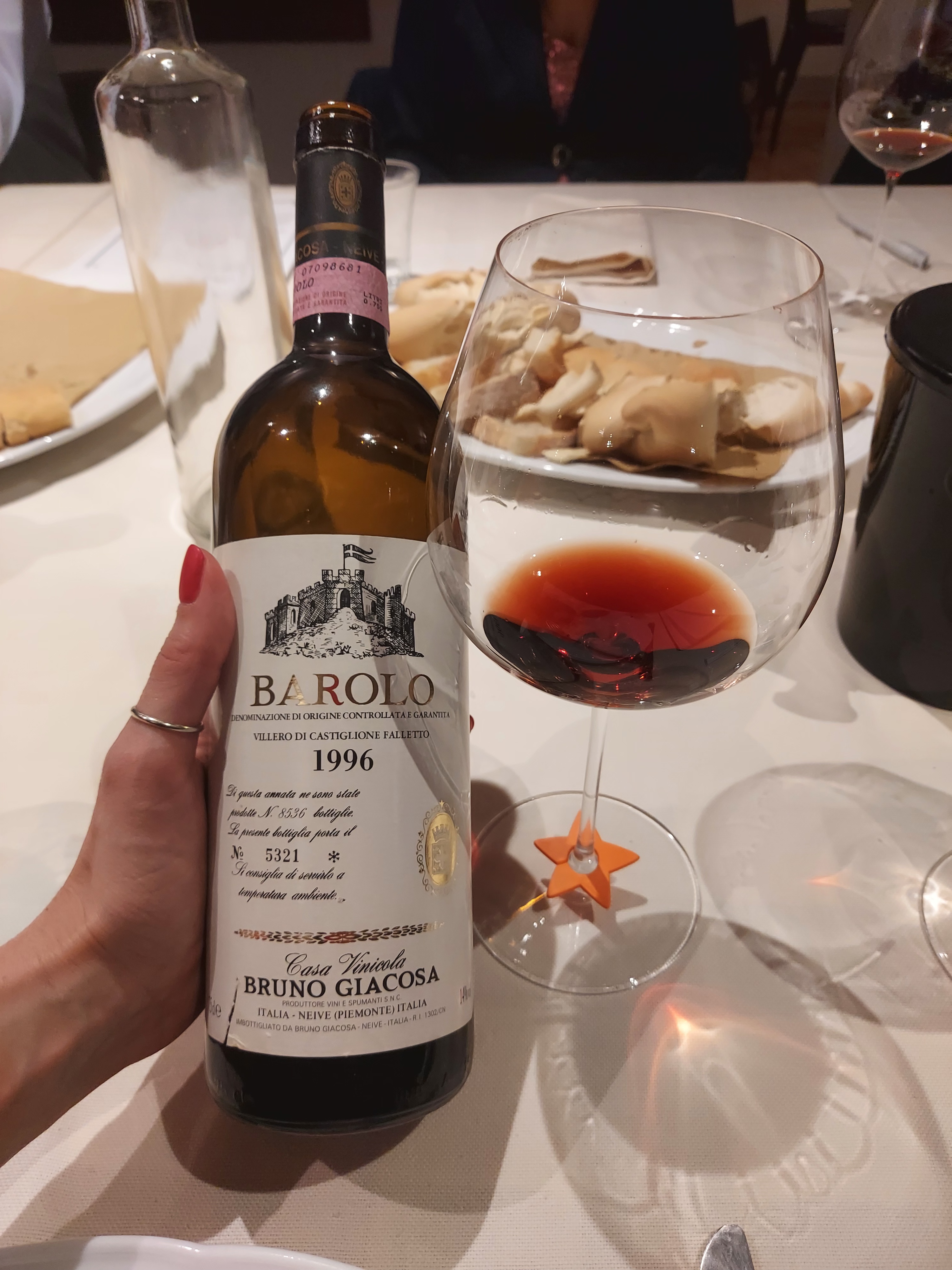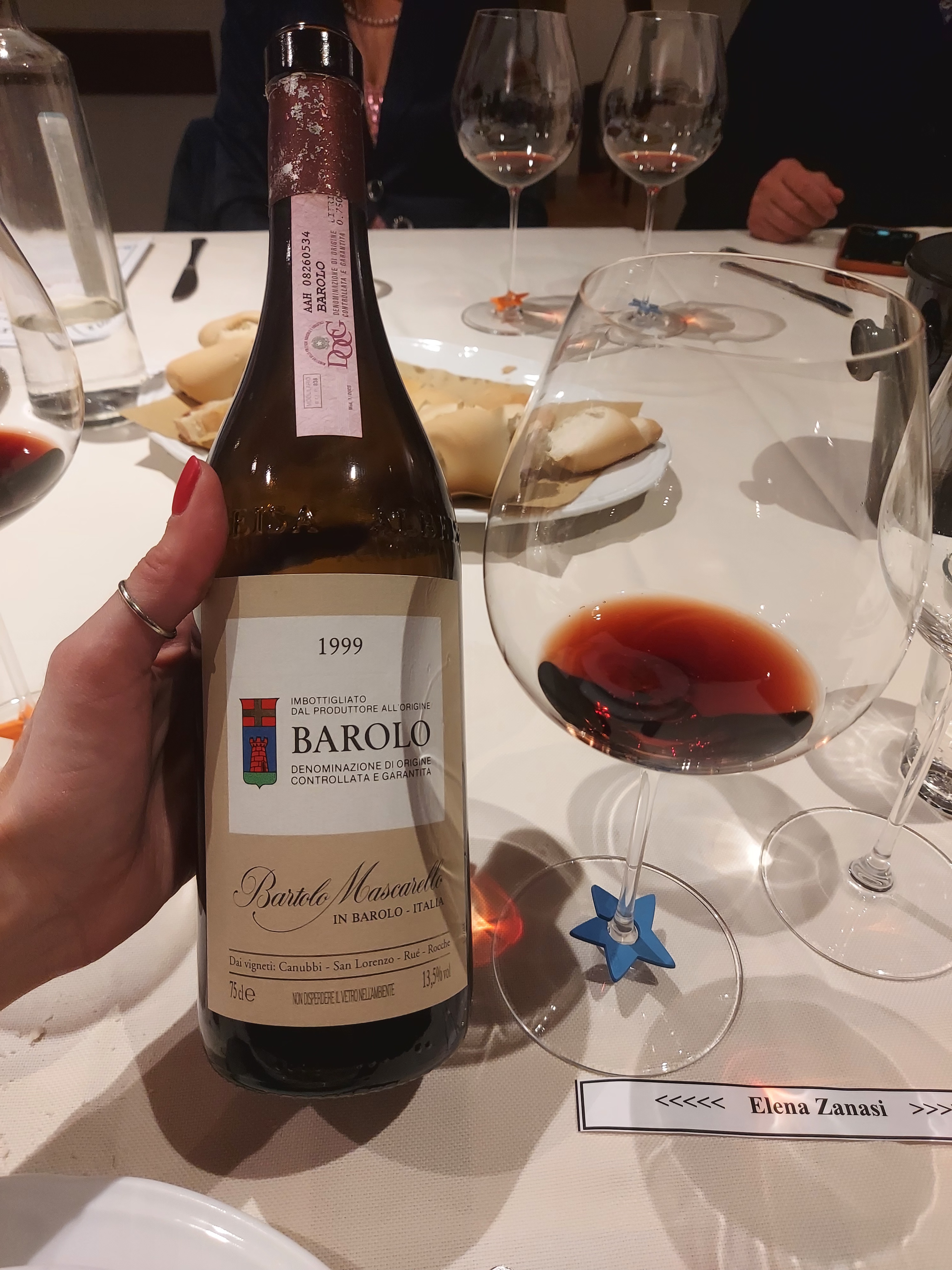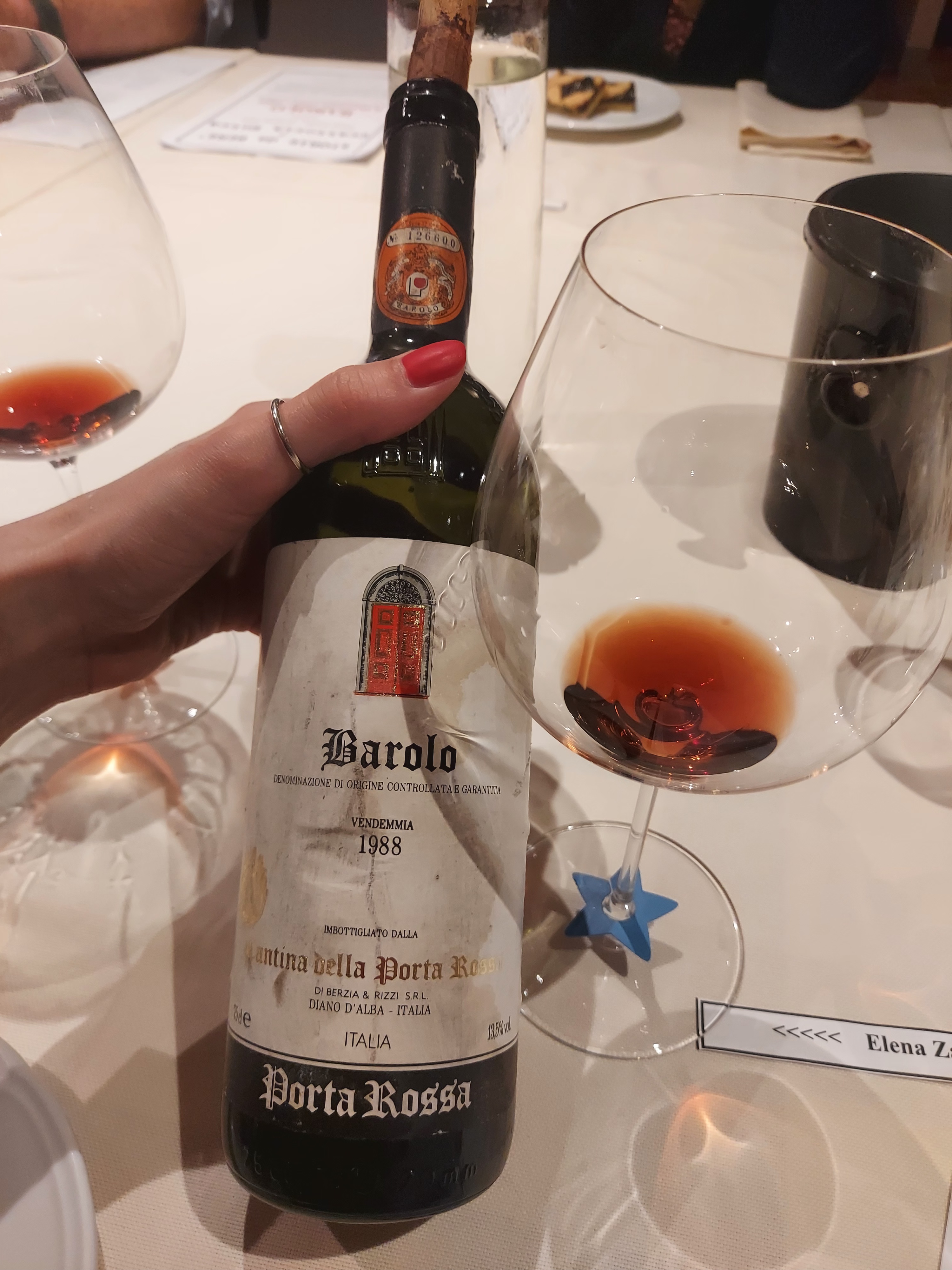 Siamo stati ripagati con un vino fuori dal coro offerto da Antonio, come il Barolo 1988 della Cantina della Porta Rossa, azienda a me sconosciuta, originaria di Diano d’Alba. Il colore era scarico, con profumi che stavano virando verso i terziari. Vino anch’esso agrumato, con note di cioccolato bianco.