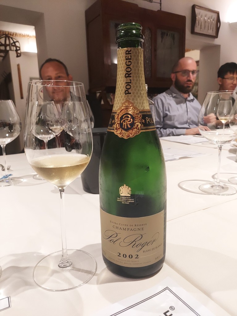 Appena seduti ci hanno dato il benvenuto con salumi emiliani, schiacciata al forno e lo Champagne blanc de blancs 2002 di Pol Roger. A differenza del Barolo, questa annata in Champagne è stata preludio di imprese eccezionali e immense soddisfazioni. Il naso, sorprendente giovane e oltremodo complesso, conferma l’innegabile potenzialità d’invecchiamento dello chardonnay. I terziari sono appena accennati in un sorso dinamico e persistente, accompagnato da un corredo aromatico raffinato, ricco di fiori bianchi e frutta secca, assieme a un leggerissimo ricordo ossidativo. Infine la bolla elegante e intensa non lascia traccia di alcuna grassezza.