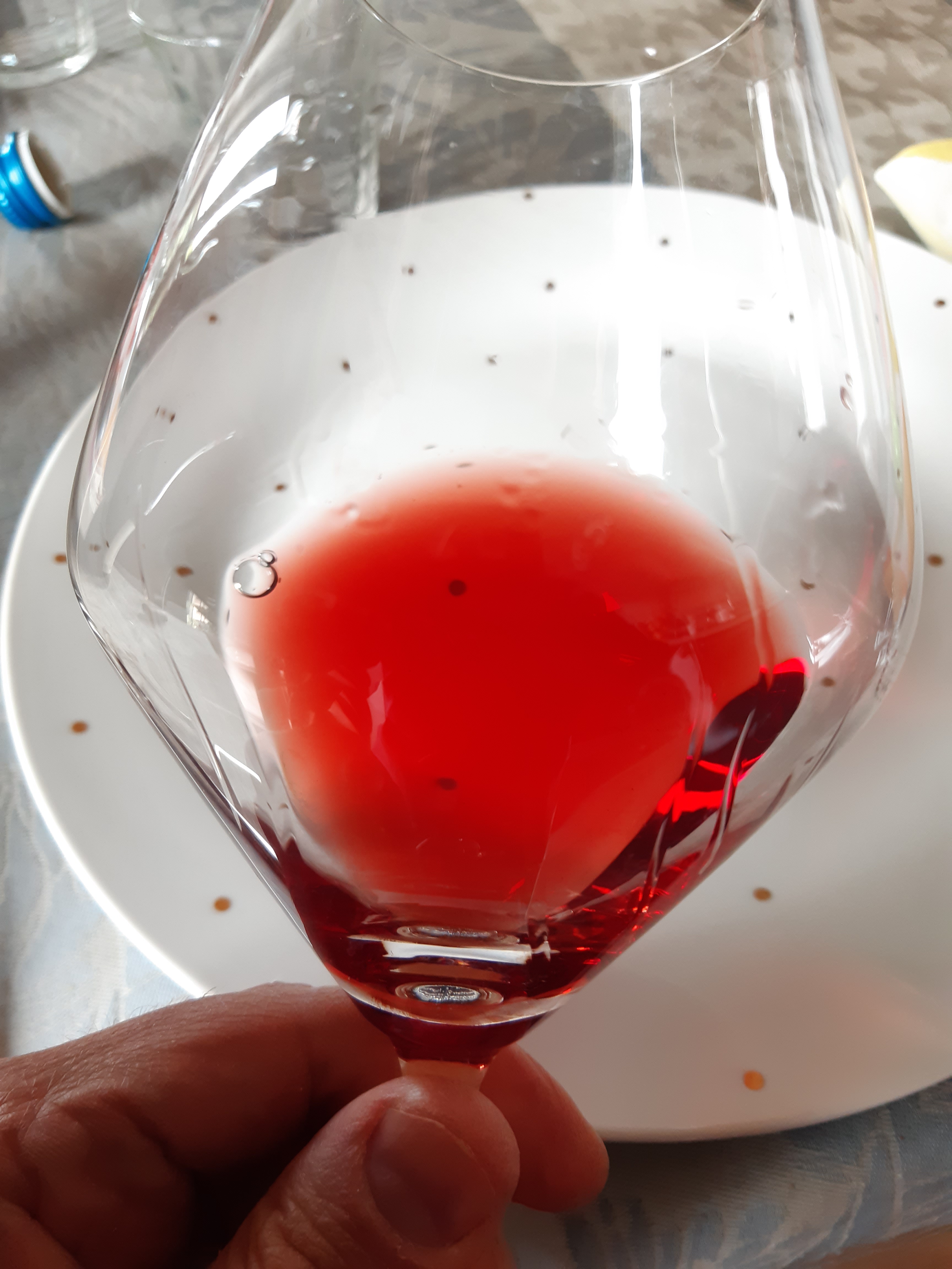 Bellissimo colore granato chiaro, screziato da vivaci lampi rubino. Naso semplice ma ricamato: ribes, fragoline ed una nota ematica di contorno. Bocca magra dalla spiccata acidità, tannini fini ma ben presenti e calore alcolico che scappa un po’ via in chiusura. Migliora molto nel bicchiere.