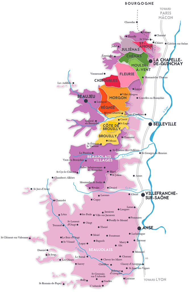 Il Beaujolais è una delle regioni vinicole francesi più trascurate, o meglio misconosciute. Fino a 30-40 anni fa il territorio era noto prevalentemente per il Beaujolais Nouveau, il famoso vino novello francese che invadeva a novembre mezza Europa al grido “le beaujolais nouveau est arrivé!”. In anni più recenti il consumo di questo vino ottenuto da macerazione carbonica è diminuito (-60% in 30 anni!) e i degustatori più curiosi hanno imparato a conoscere le zone più nobili della regione, ovvero le zone ed i vini dei 38 comuni del Beaujolais Villages e soprattutto i 10 crus del Beaujolais, dichiarati AOC uno ad uno, progressivamente, dal 1936 al 1988.
