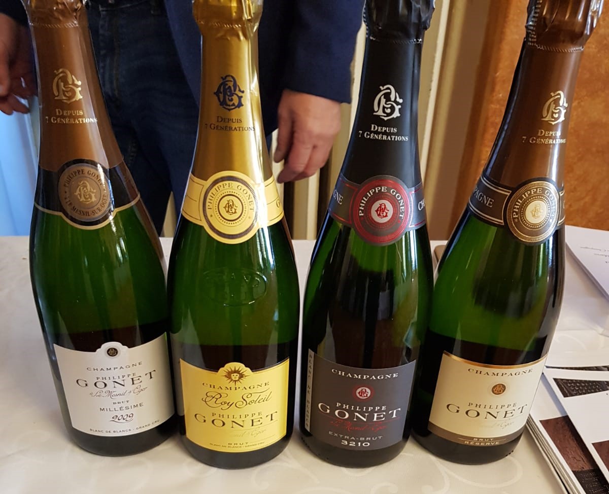 Philippe Gonet è una maison a conduzione familiare della Cote de Blancs. Propone una serie vini molto validi, naturalmente in maggioranza BdB. Il Brut Reserve, classico blend 60% PN, 30% CH, 10% Meunier leggermente dosato (8 gr/lt), è un vino che definirei confortevole, molto pulito, sentori cremosi, di crosta di pane, di pasticceria, frutta chiara. In bocca è cremoso e fresco. Il Blanc de Blancs 3210, chardonnay non dosato, è netto, diretto, quasi tagliente sia al naso sia all’ingresso in bocca. Fiori bianchi ma anche sentori verdi di foglie e corteccia di sambuco, frutta bianca acerba, agrume amarognolo. Decisamente un vino giovane. La cuvèe Roy Soleil BdB matura parzialmente in legno. Il vino è intenso, note di crema di limone, di campi di fiori in montagna, di bignè speziati. In bocca è sorso di spessore e di freschezza, lungo, tornano la pasticceria e l’agrume. Ter Blanc è un vino proveniente da vigneti di chardonnay non trattati chimicamente, matura in botti grandi di rovere, passa almeno 60 mesi sui lieviti. Al naso è potente, pesche bianche, legno dolce, nocciole, mandarini e bergamotto a dare freschezza. Grande intensità al sorso, fresco, sapido e gessoso, con ritorni di crema e di agrumi. Il millesimato 2009, anch’esso BdB aggiunge grassezza a quanto si trova nel Ter Blanc, con note di spezie, di pane, di canditi. Una freschezza un po’ spenta ne rende un po’ pesante il transito in bocca.