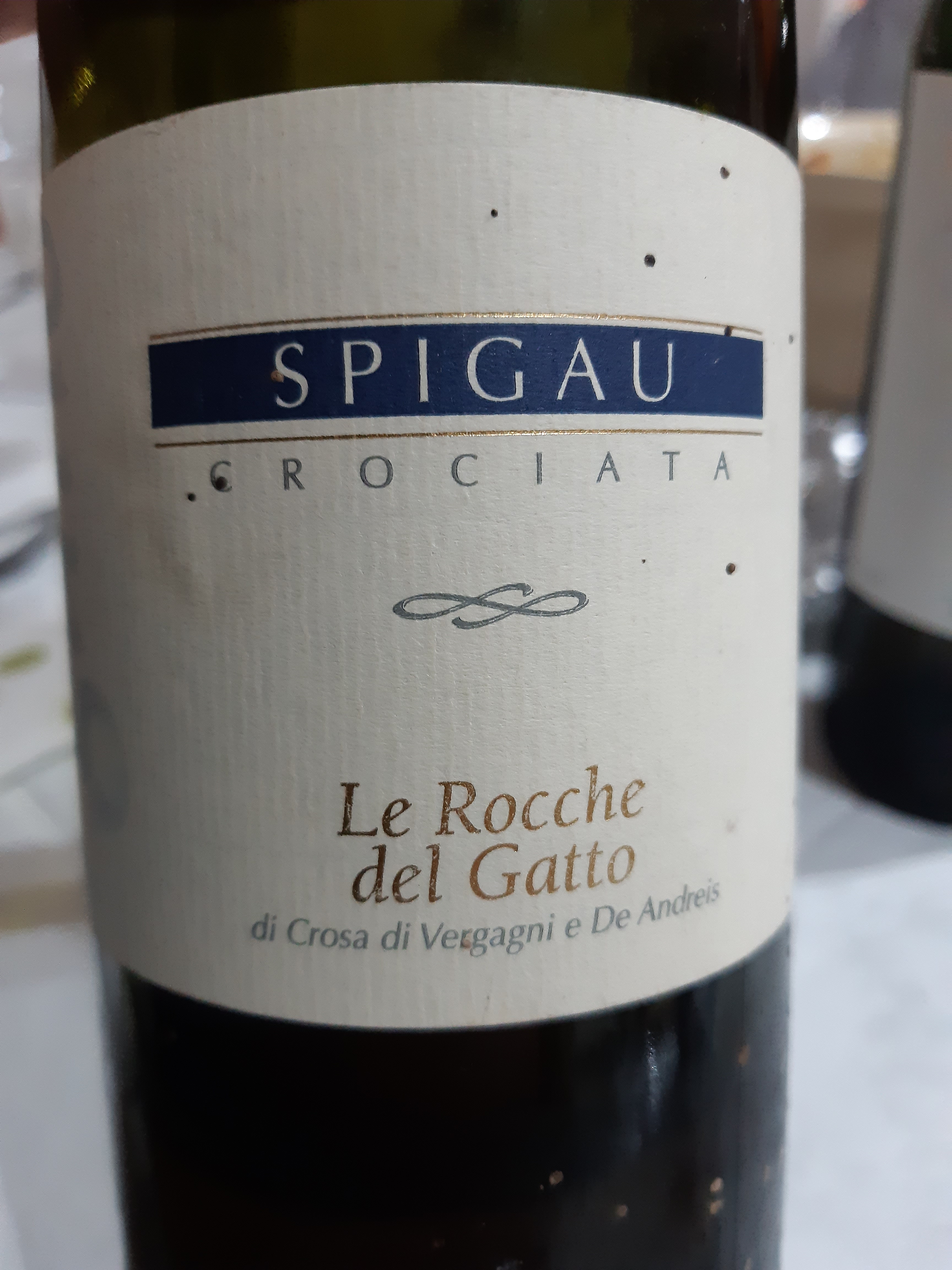 Il vino fortunatamente si presenta integro fin dal bel colore giallo oro lucente. Tripudio di sensazioni odorose che vanno dall’idrocarburo al limone candito, dalla scorza d’arancia allo zenzero, dal pepe bianco alla felce… A tanta complessità olfattiva fa da contraltare un sorso di grande droiture, con una punta di anidride carbonica ancora presente (a 14 anni dalla vendemmia!) ed una acidità strabordante che sferza il palato e rende la beva pericolosa. Nonostante sia di corpo piuttosto esile, il vino ha un’ottima dinamica e una elegante e lunga persistenza. I ritorni aromatici sono di agrumi e roccia.